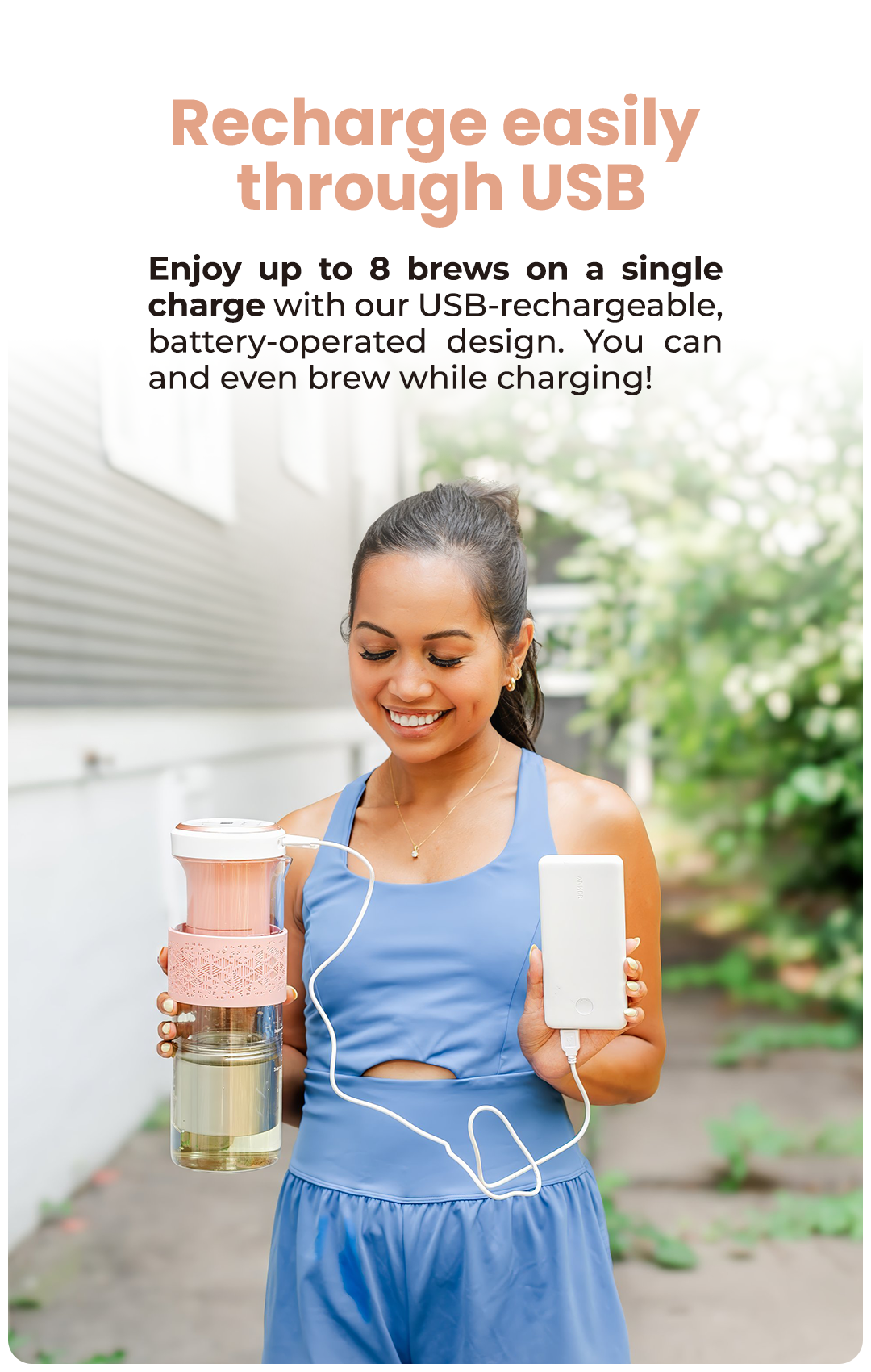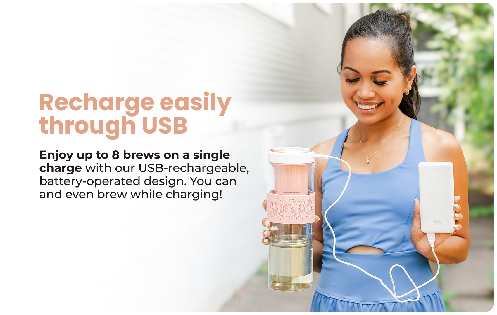Rechargeable and perfect for on-the-go, with 8 brews per charge.